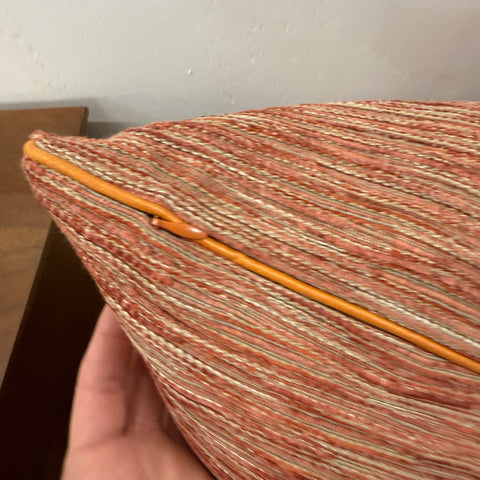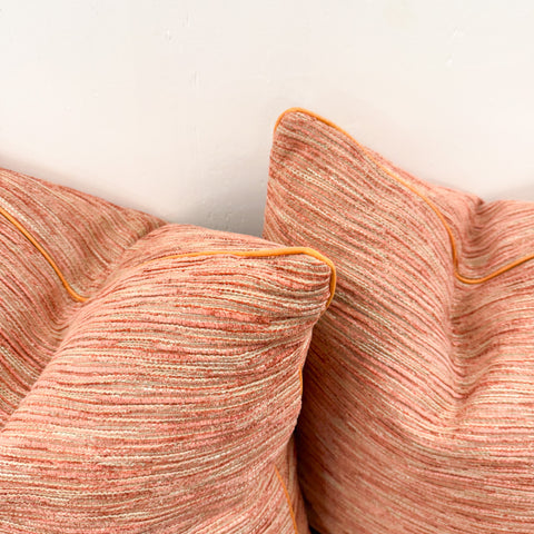Hand-sewn pillow covers in a soft coral chenille with subtle striping and a contrasting orange welt. Includes plush down inserts.