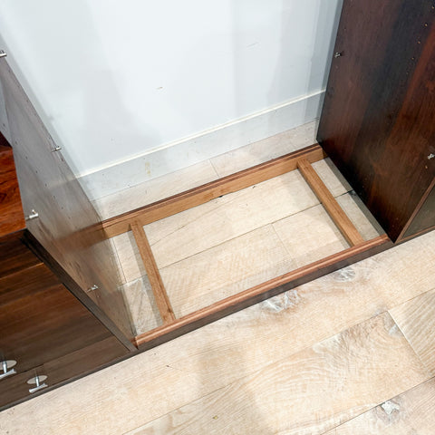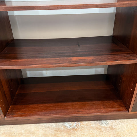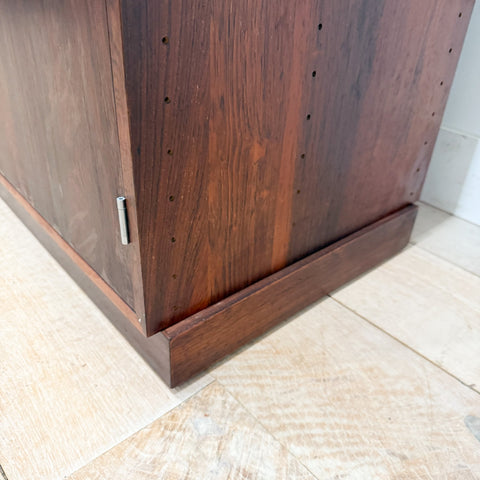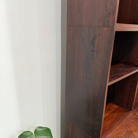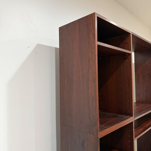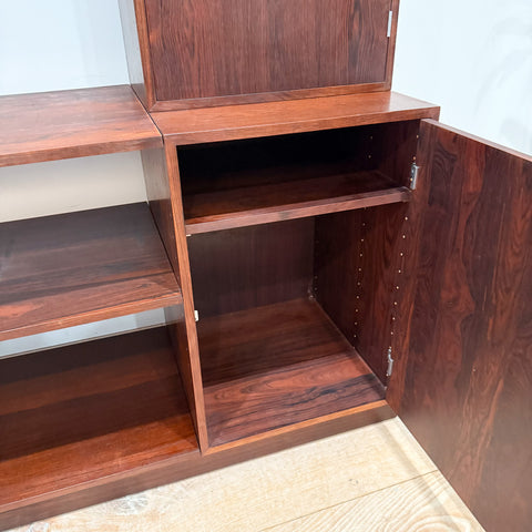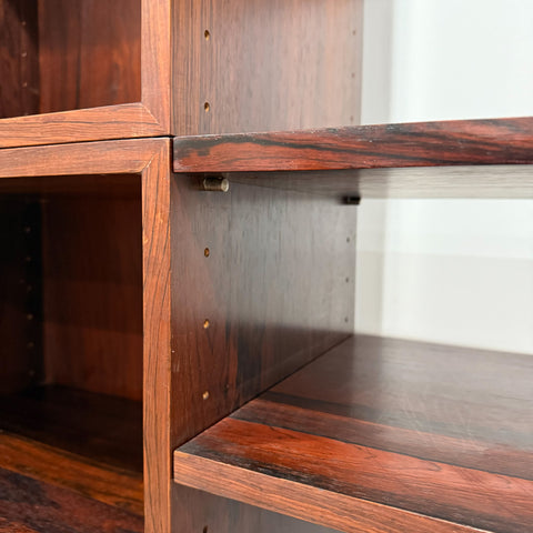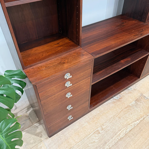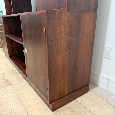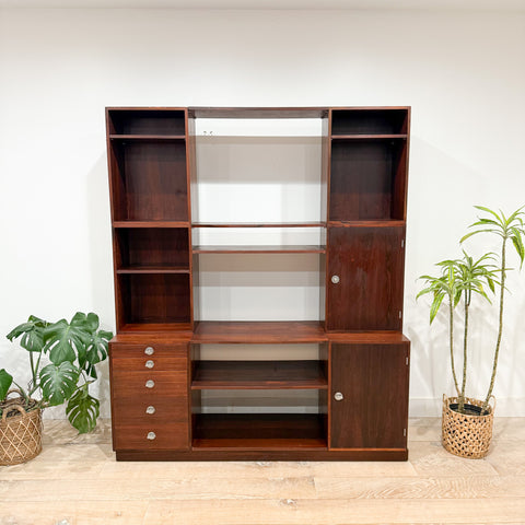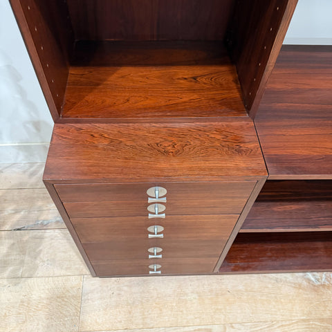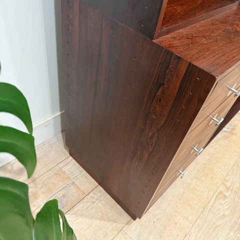 Beautiful rosewood mid century wall unit designed by Finn Juhl, offering a mix of open shelving, closed storage, and a bank of dovetailed drawers with original hardware. Adjustable shelves throughout provide flexible storage options. The piece retains its maker’s badge and features stunning rosewood grain patterns.