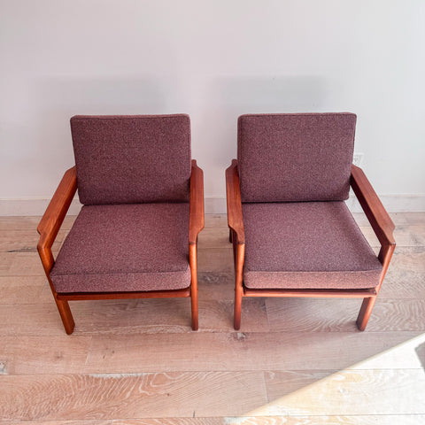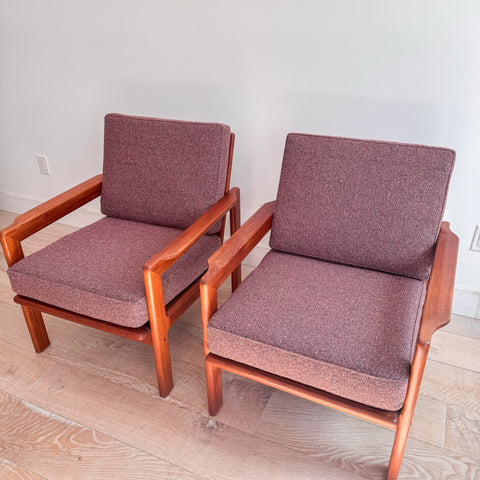 Mid century danish teak loung chairs. New webbing, foam and a mauve tweed upholstery. Some light scuffing/scratching to the teak frames from age appropriate wear.