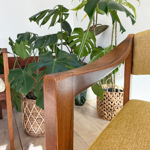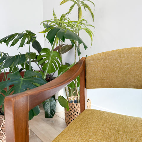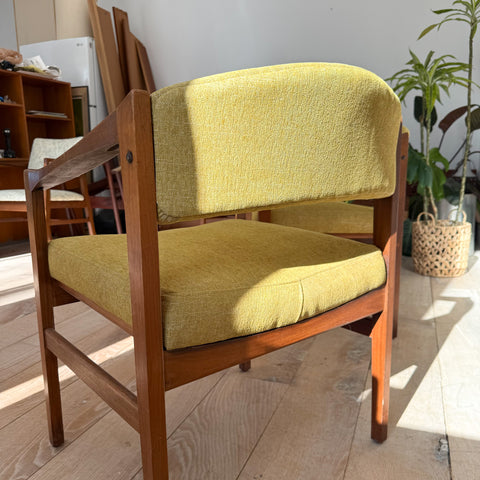 Pair of sculpted walnut occasional chairs by Edward Wormley. Known as the Quinn chair. New soft mustard colored upholstery. Some light scuffing/scratching to the walnut frames from age appropriate wear.