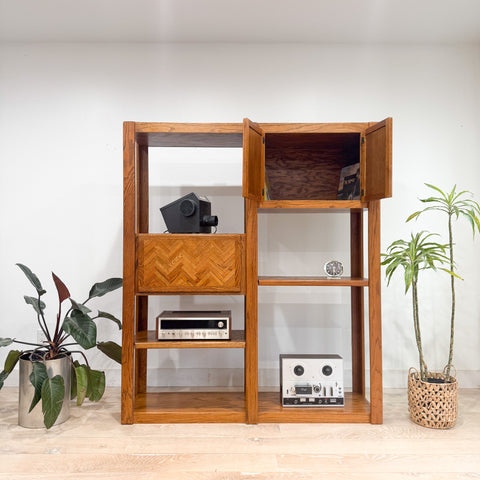 Vintage one-piece oak wall unit with beautiful herringbone door and drop-down cabinet — perfect for storing records or media equipment. Features adjustable shelving and tons of display space.
