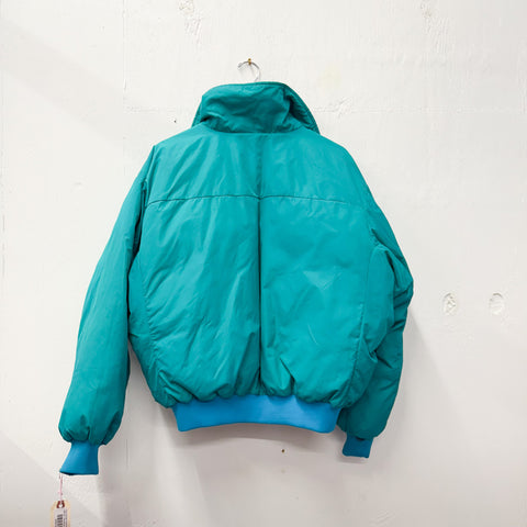 A classic retro Columbia puffer in a vibrant teal with contrasting navy details. This style is reversible, giving you two looks in one warm, cozy jacket. Features elastic cuffs and waistband for a snug fit, a zip-up front, and that iconic Columbia Sportswear patch. A perfect winter throwback piece.
