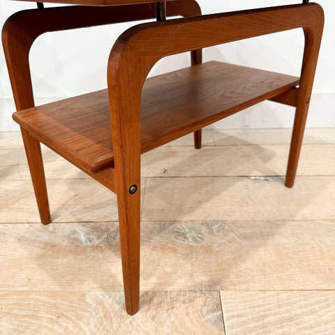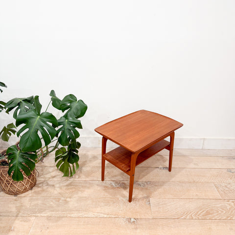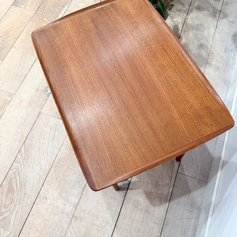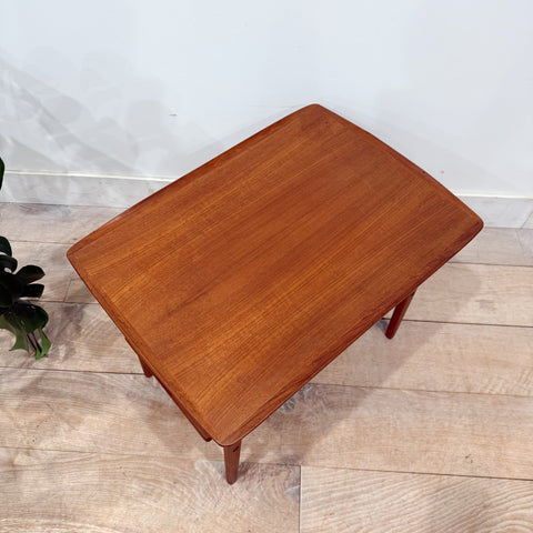 Mid century modern danish teak scuplted end table by Arne Hovmand-Olsen for Mogens Kold. Some light scuffing/scratching/areas of discoloration from age appropriate wear.