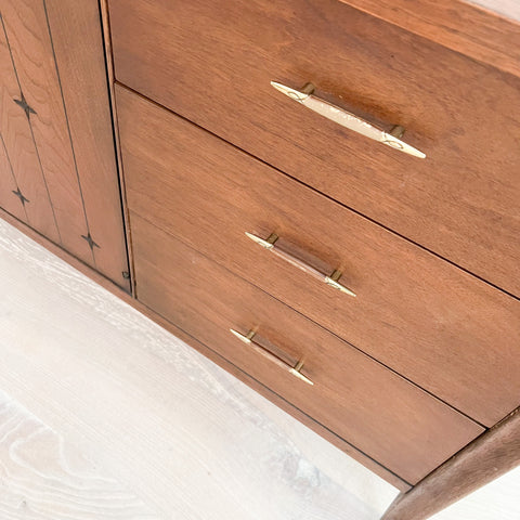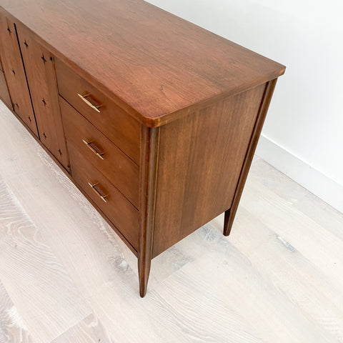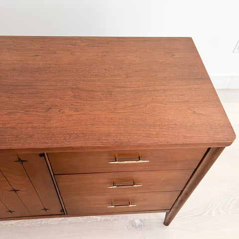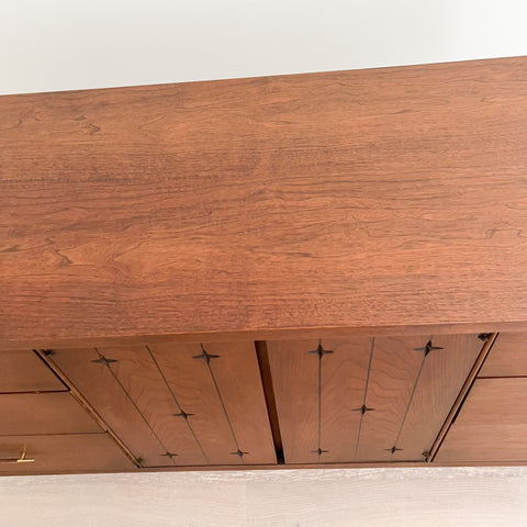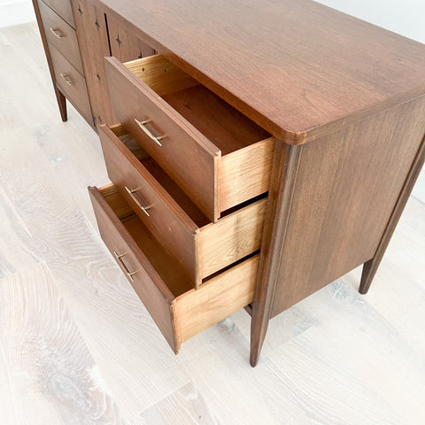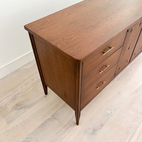 Mid century modern low walnut dresser by the Broyhill Saga line. The top has been sanded and restored. Some light scuffing/scratching from age appropriate wear.