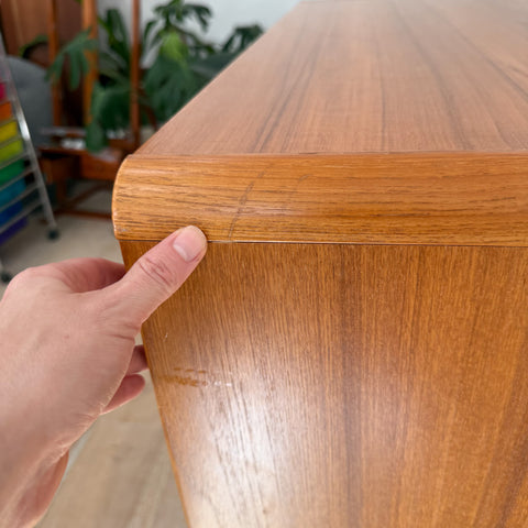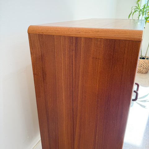 Mid century danish teak cabinet on tapered legs. Some scuffing/scratching from age appropriate wear. Adjustable shelving.