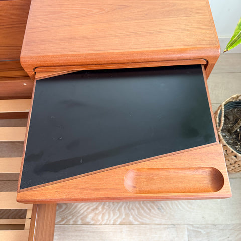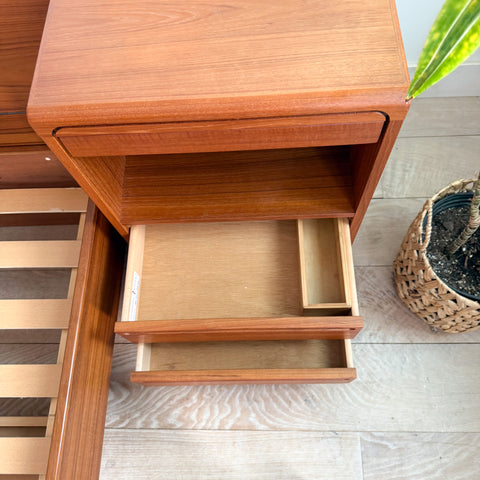 Beautiful Danish teak queen-size bed with integrated nightstands and hidden storage compartments. This set features generous under-bed drawers, sliding black laminate trays, and smooth rounded teak detailing throughout. Overall great vintage condition with minor wear from age.