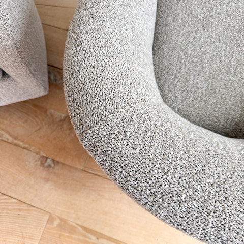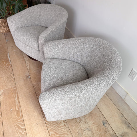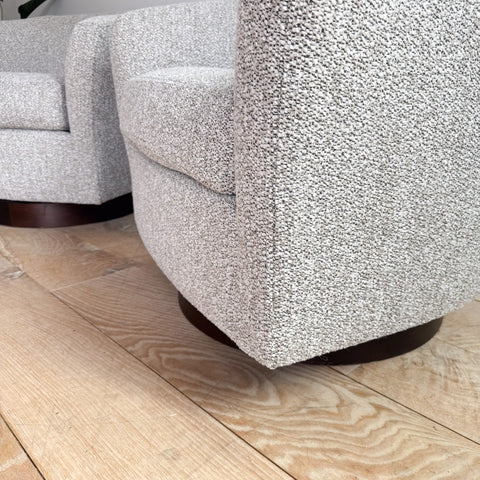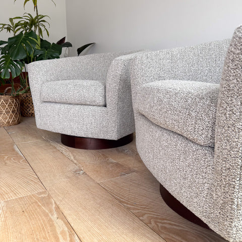 Pair of vintage swivel chairs - New grey tweed upholstery. Some light scuffing/scratching to the swivel bases from age appropriate wear.