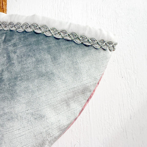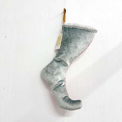 A beautifully crafted handmade stocking featuring a muted pink floral pattern and soft velvet backing. Finished with a decorative trim and a sturdy hanging loop.
