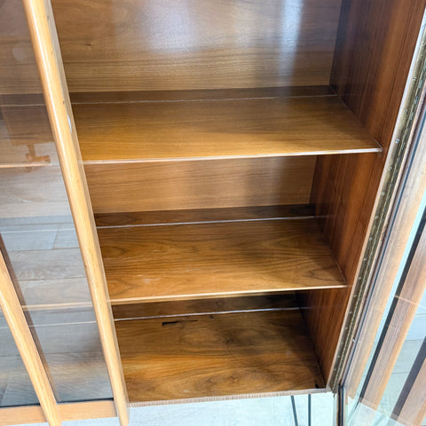 Mid century modern sculpted front curio cabinet on hairpin legs. Adjustable shelving on the smaller cabinet side. Some light scuffing/scratching from age appropriate wear.