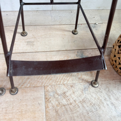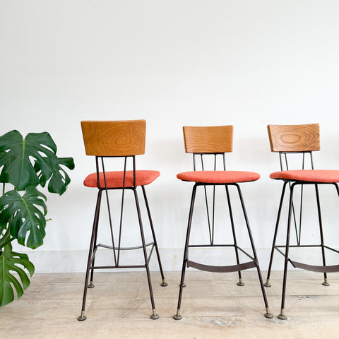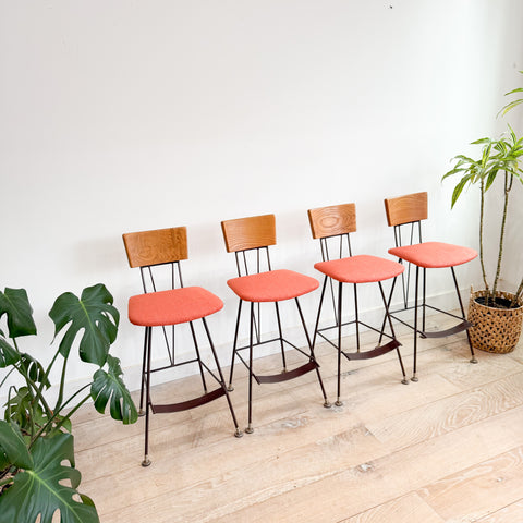 Beautiful and hard-to-find set of 4 vintage barstools designed by Richard McCarthy. These stools feature sculptural iron frames, contoured wood backs with gorgeous grain, and brand-new orange upholstery on the seats. Footrests and splayed legs keep the design both sturdy and visually light. Some light wear on the frames from age, as shown.