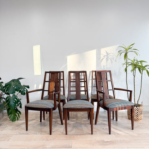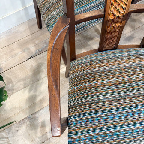 Set of six mid-century dining chairs by Century Furniture featuring sculpted mahogany frames, cane back inserts, and fresh upholstery in a multi-toned striped fabric. Includes two armchairs and four armless chairs. Light wear consistent with age.