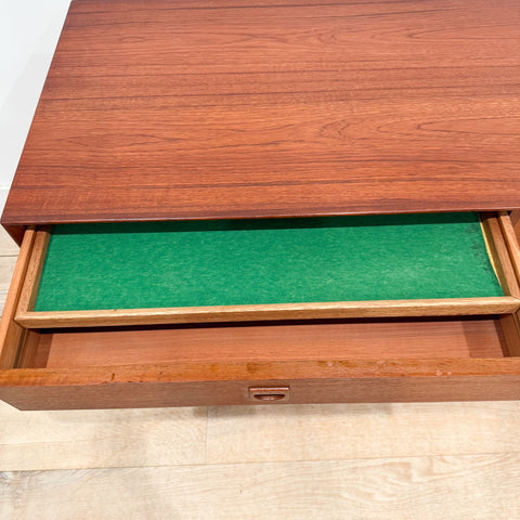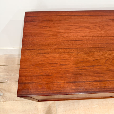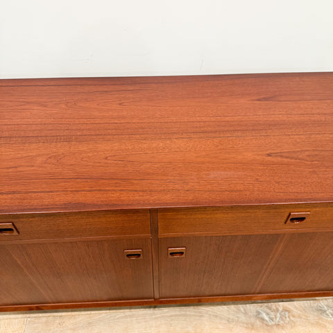 Beautiful vintage teak sideboard featuring clean mid-century lines and sculpted recessed pulls. Offers plenty of storage with two drawers, adjustable shelving, and ample space for records or media components. A versatile piece perfect for living or dining spaces.