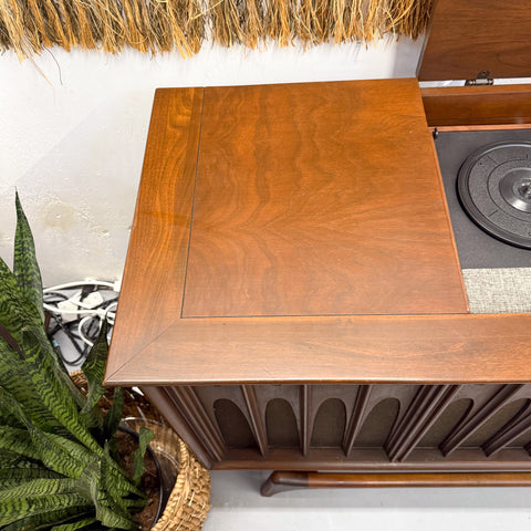 The 1969 RCA Brasilia “Campobello” Stereo Console is an iconic mid-century centerpiece with the unmistakable Brasilia look—rich walnut, clean lines, and those sculpted floating legs/base that make it feel like it’s hovering. This was one of RCA’s premium consoles, built to sound as impressive as it looks, and it’s been thoughtfully updated for everyday use with a modern 100-watt stereo amplifier with Bluetooth for easy streaming plus a modern turntable for reliable vinyl playback. The result is the best of both worlds: a collectible design-forward cabinet with the convenience and performance of a contemporary sound system—perfect for an MCM living room, studio, or lounge.