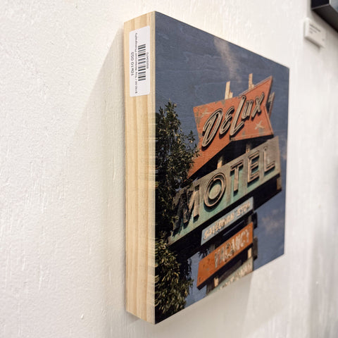 Deluxe motel neon sign photo on wood panel from Troy Winterrowd Photography