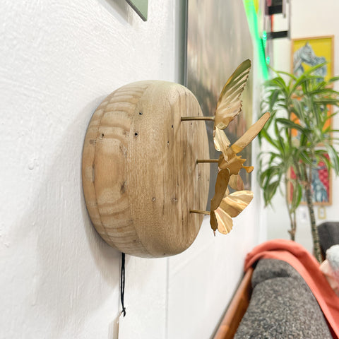 Inspired by 70's wall art, Sawyer Home has crafted this wall piece out of wood and brass. Butterflies are brush finished and sealed with a museum quality wax polish. Wood has an oil and beeswax finish. Keyhole on the back for hanging