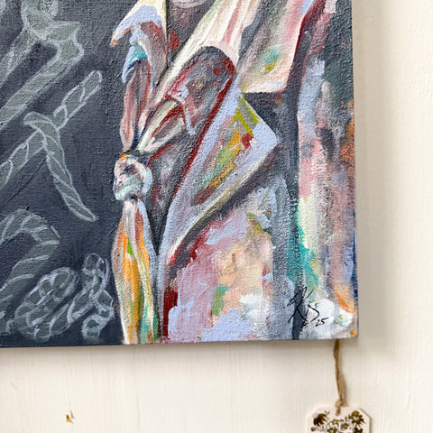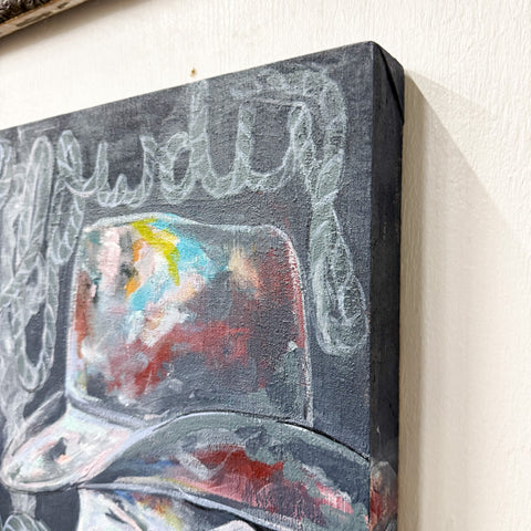 A striking original painting by Krystal Sokolis (Ophilya Handmade), featuring a textured, expressive portrait of a cowboy with hand-drawn rope lettering. Painted in Krystal’s signature bold, layered style, this piece adds color, character, and Western charm to any space.
