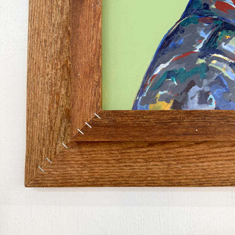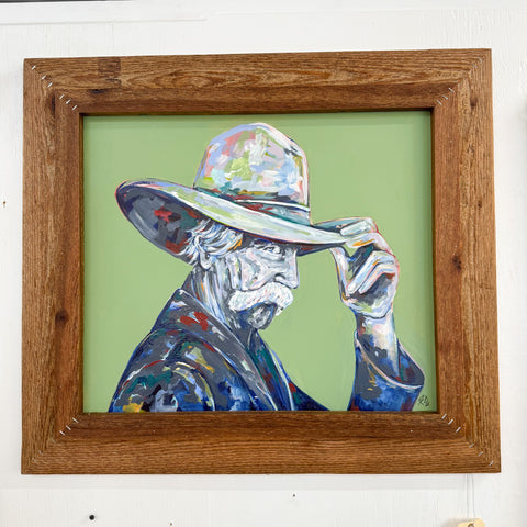 Rich with texture and color, Abstract Cowboy by Ophilya Handmade captures rugged character and quiet strength through expressive, layered brushwork. The bold green background adds a modern edge, while the reclaimed wood frame—stitched with exposed nails—brings warmth and craftsmanship to the composition.