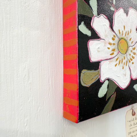 Bold yet graceful, Wild Roses in Black by Red DuMonde brings vibrant energy to a timeless floral subject. Set against a striking black background, luminous white blooms with hints of pink and gold seem to glow from within. The artist’s signature painted edges in bright coral and ochre add a playful contrast that enhances its modern, hand-crafted charm.