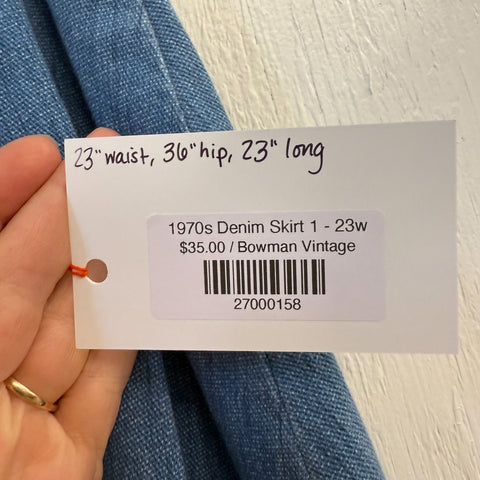 Classic 1970s A-line denim skirt with a high waist and frayed raw hem for a perfectly lived-in look. Features belt loops, pleated front detail, and a button-and-zip closure. A timeless, easy-to-style staple that pairs effortlessly with boots or sneakers.