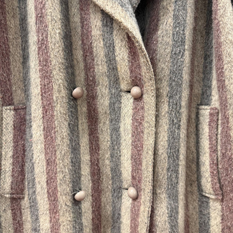 A gorgeous 80s-era double-breasted wool coat featuring vertical stripes in muted grey, taupe, and mauve tones. The tailored silhouette gives it a timeless feel while the soft, textured wool adds warmth and dimension. Finished with tonal covered buttons and front welt pockets. Fully lined for comfort.