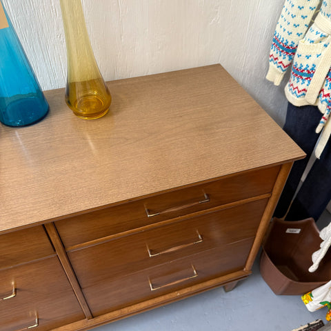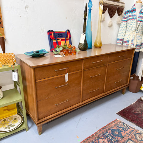 Gorgeous mid-century dresser by Kent Coffey, part of The Nomad collection. Features a sleek Formica top, nine spacious drawers, and tapered legs with brass-capped feet. The warm walnut finish and clean lines make this a timeless, functional addition to any bedroom or living space.