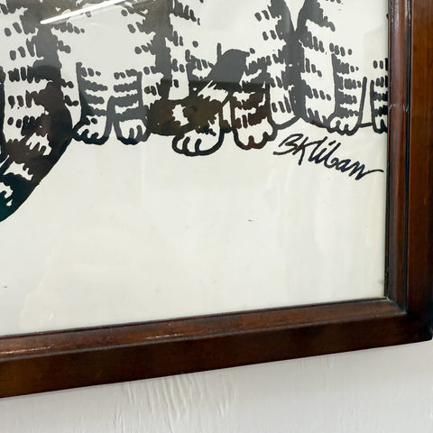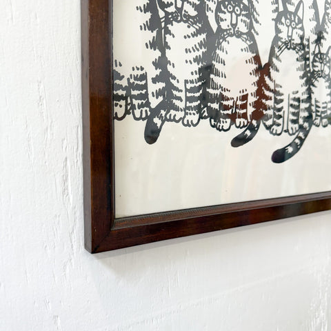 Charming vintage Kliban Cats print by artist B. Kliban, published by Workman Publishing Company in 1977. This classic black-and-white illustration features a whimsical crowd of Kliban’s signature striped cats—playful, quirky, and full of character. Framed in a dark wood frame that complements its mid-century charm.