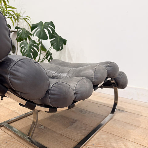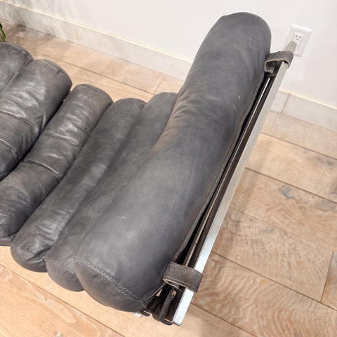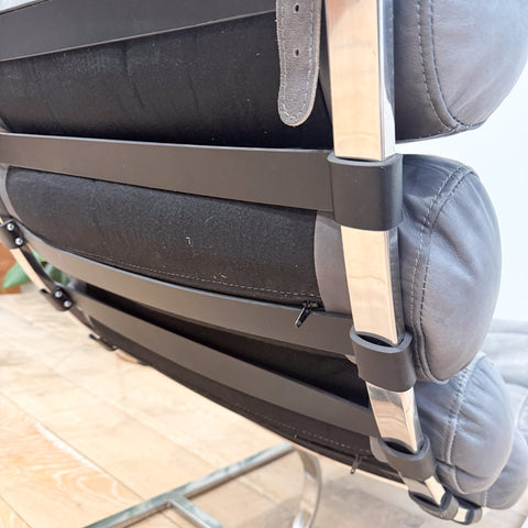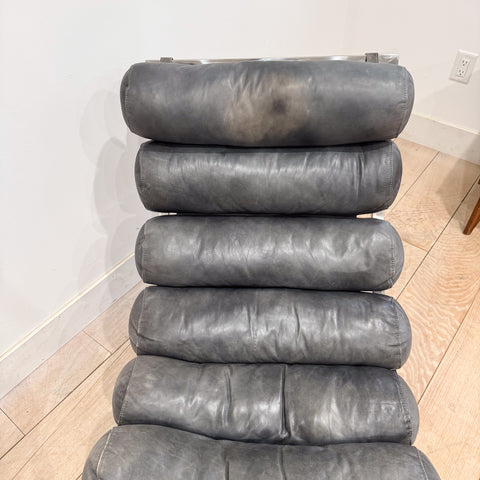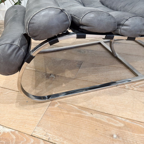 Rare vintage Corona lounge chair with bent chrome base and aged grey leather with great patina! Super comfortable. Some light wear and discoloration from age/use.