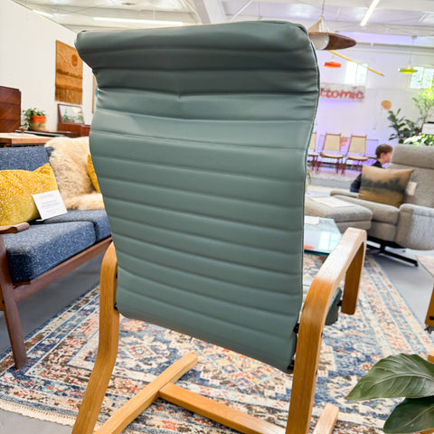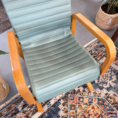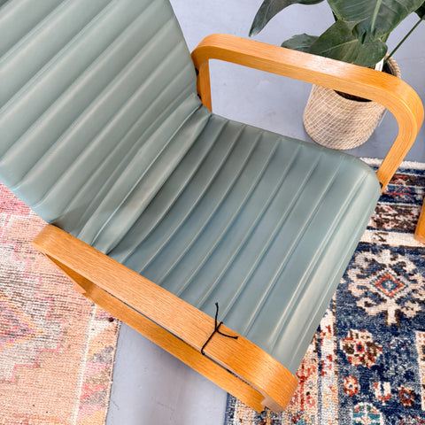 Vintage Thonet lounge chairs featuring bentwood frames and seafoam green vinyl upholstery. These sculptural chairs offer both comfort and style with their cantilevered bases and supportive high backs — perfect for adding a touch of retro modern design to any space.