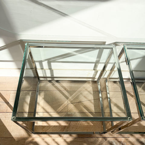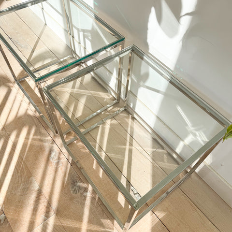 A sleek and timeless pair of chrome and glass end tables featuring a minimalist cube design. The polished chrome frames reflect light beautifully, while the thick glass tops keep the look airy and modern — perfect beside a sofa, bed, or as sculptural plant stands.