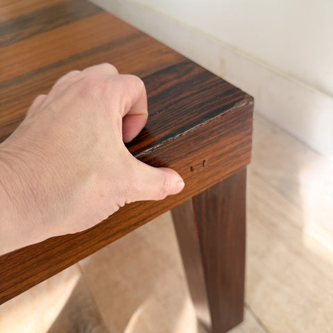 Vintage parsons style teak, rosewood and walnut coffee table. Possibly by Dyrlund or Milo Baughman. We've never seen this version before! Some scuffing/scratching/areas of veneer repair.