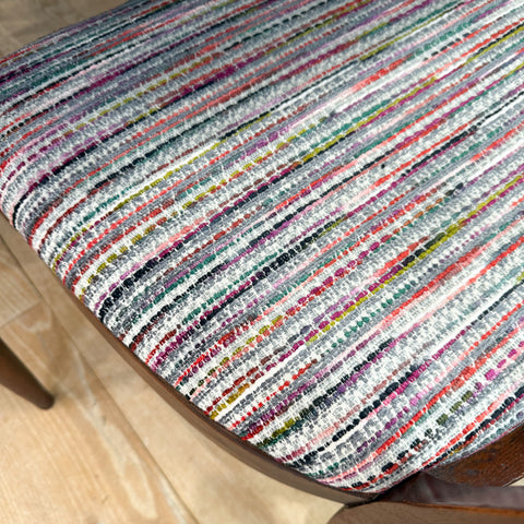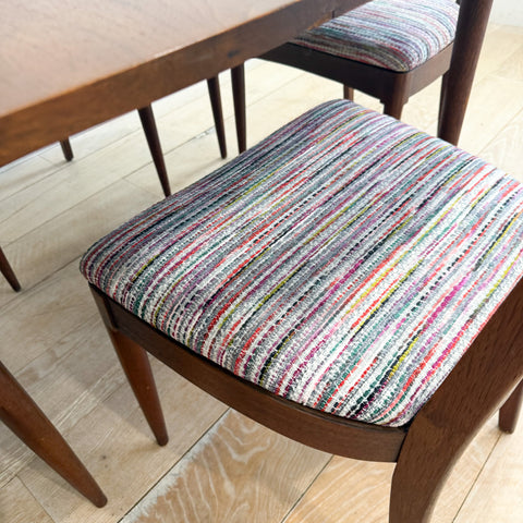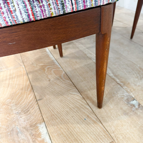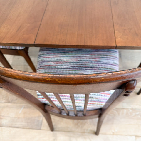 Mid century modern Broyhill Sculptra walnut dining table with 1 leaf and 4 dining chairs. The top has been sanded and restored. Some light scuffing/scratching from age appropriate wear. New colorful striped upholstery on the seat cushions.