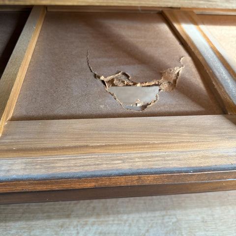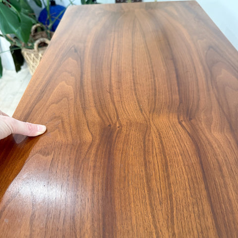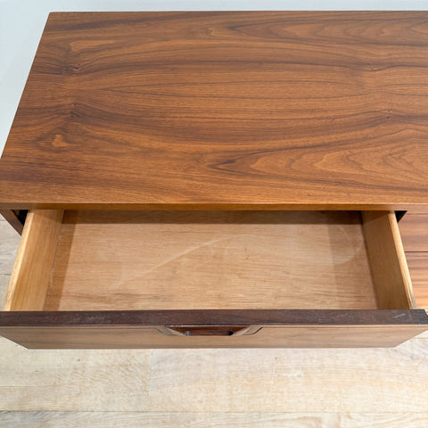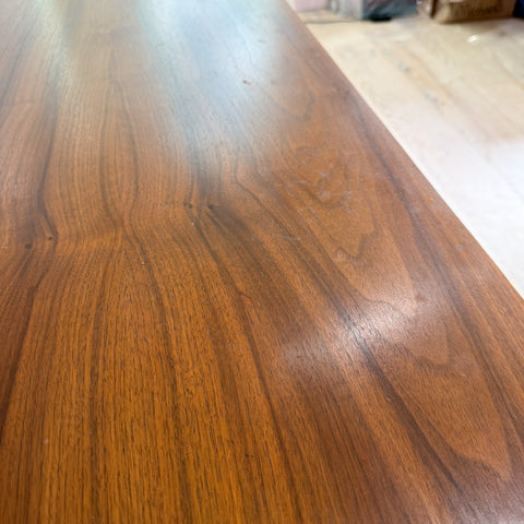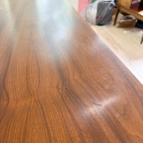Mid century modern walnut low nine drawer dresser. Some scuffing/scratching/discoloration from age appropriate wear to the original finish (see up close photos). There is a hole in the bottom of the dresser and one on the back (does not affect structural integrity or aesthetics).