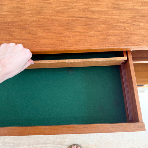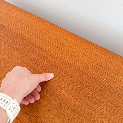 Mid century modern danish teak credenza/media console with sliding door. Some scuffing/scratching/areas of discoloration from age/wear (see up close photos). Found in Sound Furnishings at atomic.