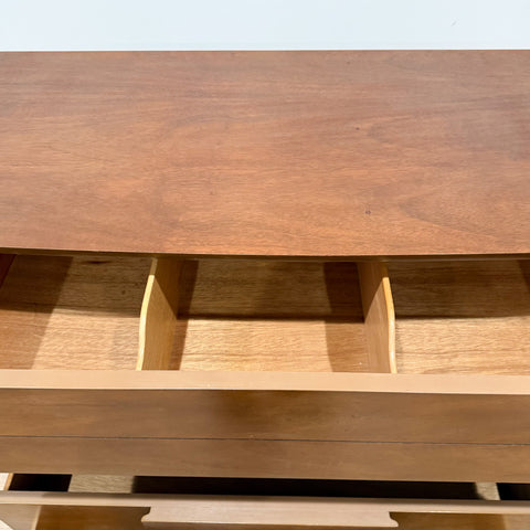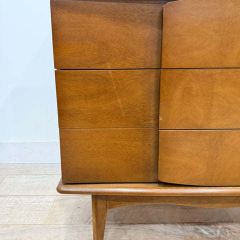 Mid century highboy by United, showcasing the brand’s signature sculpted front and warm walnut tones. Features 4 drawers, built-in dividers in the top drawer, and classic tapered legs. Light scuffing/scratching from age-appropriate wear (see photos).