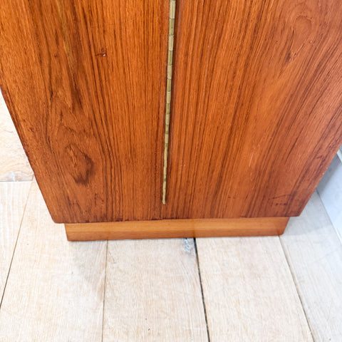 Vintage danish teak desk in a box. We have the original key to the lock box inside but the key does not work to lock the entire cabinet. The cabinet does stay closed on it's own. This piece has some scuffing/scratching and areas of veneer/wood repair (see up close photos). The hinges on one side of the desk have been replaced/repaired (see photo). Very heavy!