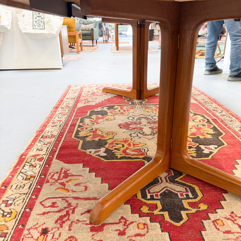 Mid century modern danish teak dining table with two leaves. The top has been sanded and restored. Some light scuffing/scratching from age appropriate wear. Without leaves its a nice round table for those that are limited on space.