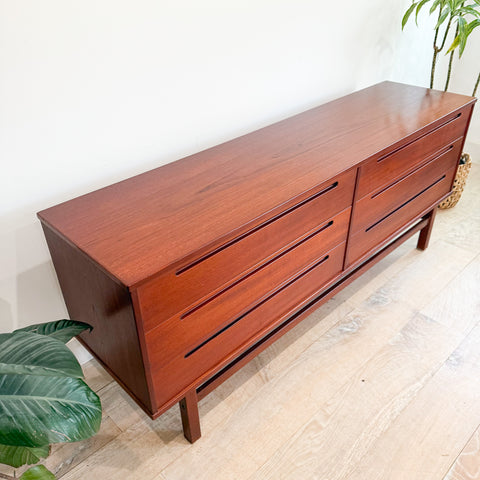 Mid century modern danish teak low 6 drawer dresser by Nils Jonsson. Some scuffing/scratching/areas of discoloration from age appropriate wear. The previous owner made a repair to legs. Faint odor inside drawers. Priced accordingly.