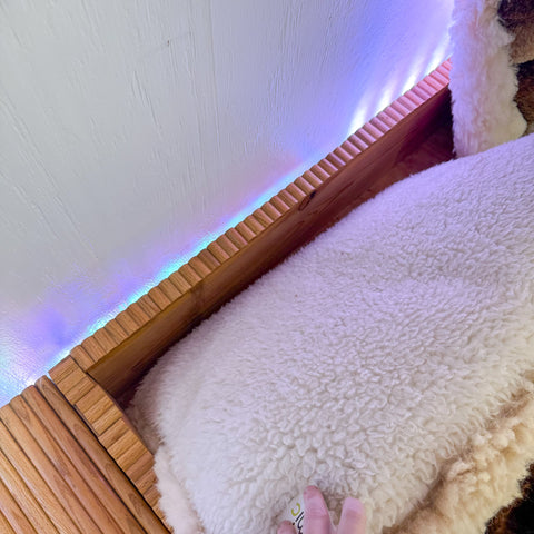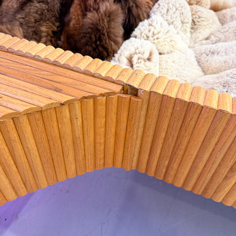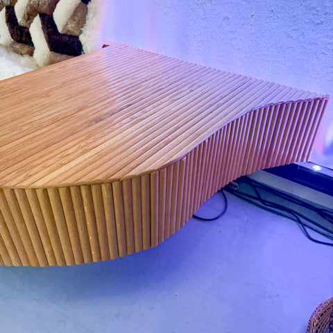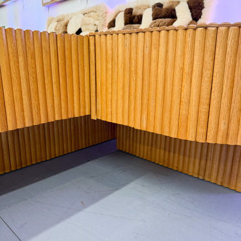 The nightstands are detachable for easier transport. This piece was custom built for its original space, so the left nightstand and the back of the left side are unfinished (without oak trim). Despite that, it remains an exceptionally unique and striking statement piece.