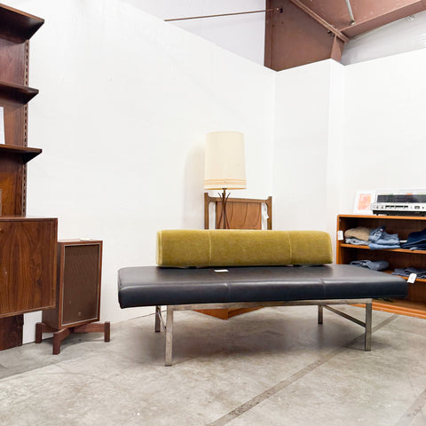 A striking modern sofa from Jack Cartwright’s SASSI collection, featuring a black vinyl seat paired with a chartreuse bolster backrest. Clean chrome legs give it a refined, architectural profile. Stylish, comfortable, and iconic mid-century design. Some light wear from age/use.