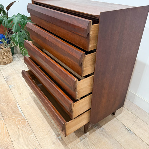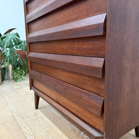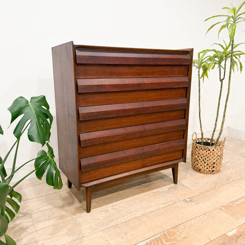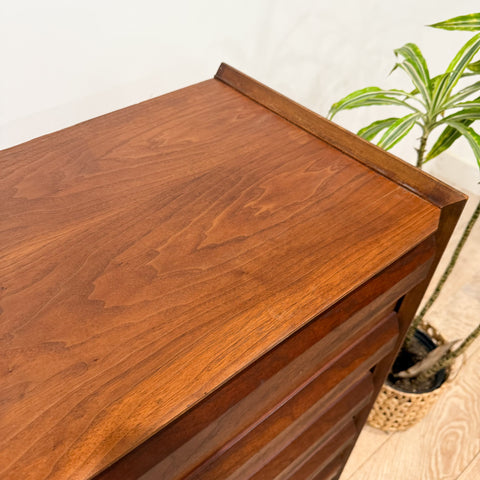 Beautiful sculpted walnut highboy from Lane’s coveted First Edition line. Features six drawers with the signature dimensional drawer fronts. Light scuffing/scratching and a few small areas of veneer repair consistent with age and use.
