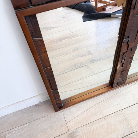 Mid century modern brutalist style large mirror by the Lane Pueblo line. Some scuffing/scratching/discoloration/small areas of veneer repair from age appropriate wear. Sought after piece!