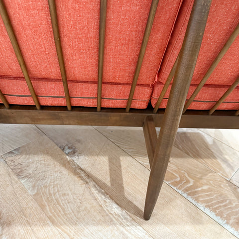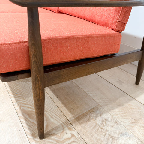 Beautiful mid-century Baumritter three-seat sofa featuring all new webbing, new foam, and fresh orange upholstery. The sculpted walnut frame shows light scuffing and light discoloration from age-appropriate wear. A classic silhouette with great lines and a supportive seat — ready for its next home.