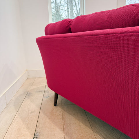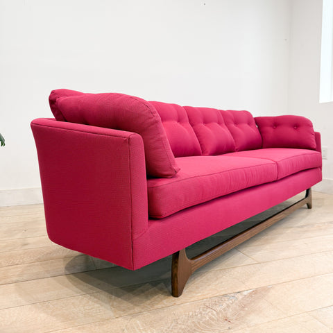 Mid century modern curved back sofa. New foam and bright pink upholstery! Super cozy and beautiful. Some light scuffing/scratching on the sculpted wooden base.