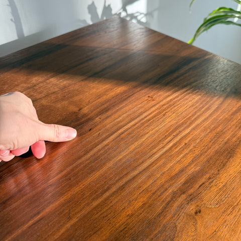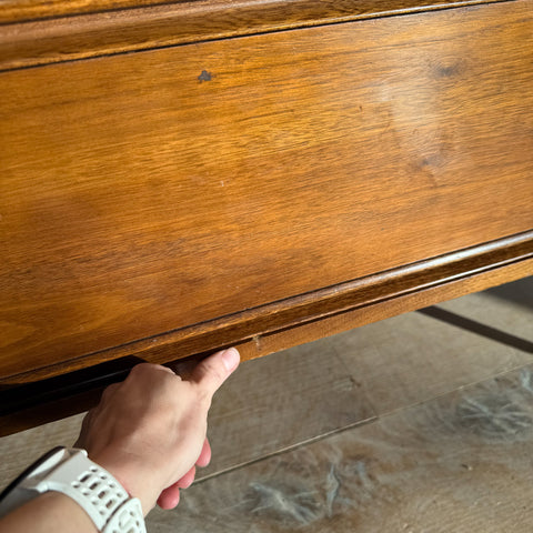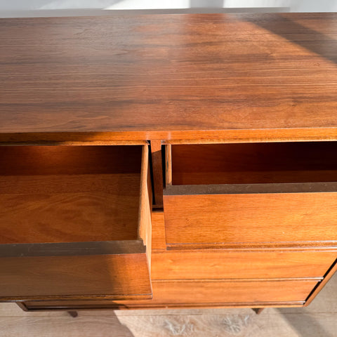 Mid-century walnut highboy dresser by Dixie featuring clean lines, recessed pulls, and tapered legs. The top has been sanded and restored, bringing out the warm walnut tone. Some scuffing, scratching, and areas of veneer repair from age and use.