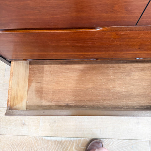 Mid century modern highboy dresser with tapered legs. The top has been sanded and restored. Some scuffing/scratching/discoloration/small areas of veneer repair from age appropriate wear.