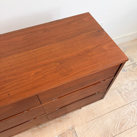 Mid century modern low nine drawer dresser with tapered legs. The top has been sanded and restored. Some scuffing/scratching/discoloration/small areas of veneer repair from age appropriate wear.