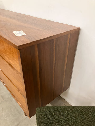Mid century low nine drawer dresser. The top and sides have been sanded and restored. Some light scuffing/scratching from age appropriate wear. Nice wood grain! Found in Midmix Furnishings space at atomic.