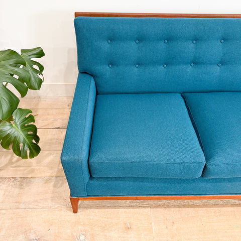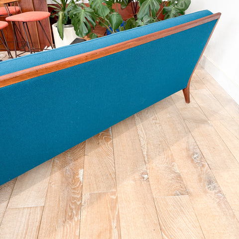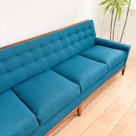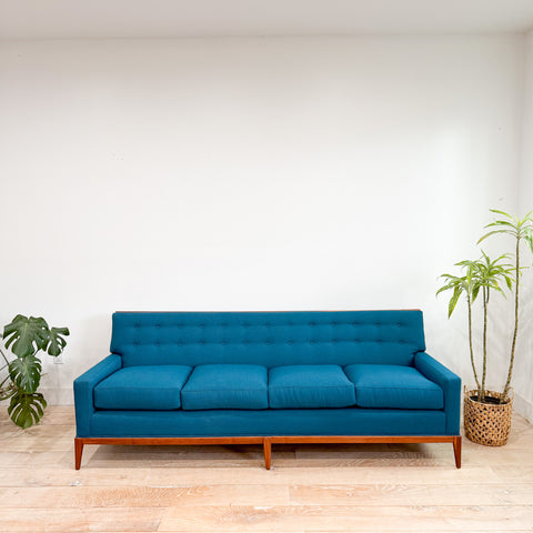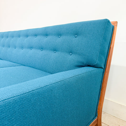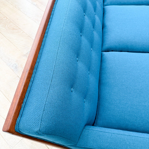 This beautiful mid-century sofa features a freshly upholstered tufted back in a rich teal blue fabric. The walnut base and tapered legs add warmth and classic MCM lines, while the newly redone cushions offer comfortable, supportive seating. A standout piece that brings both color and timeless design into any space.
