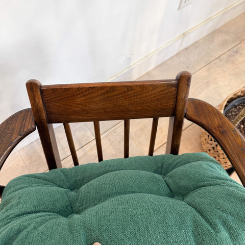 Stylish pair of mid-century lounge chairs with sculpted walnut frames and brand-new green upholstery. Comfortable tufted cushions with original spring support. Frames show light scuffing and surface wear consistent with age (see photos).