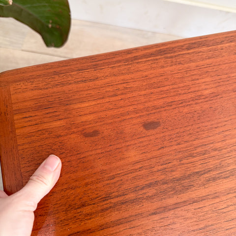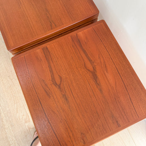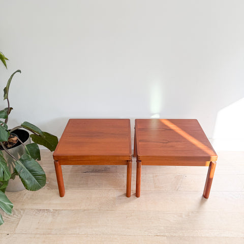 Pair of mid century modern danish teak end tables by Trioh. Some scuffing/scratching/discoloration from age appropriate wear.